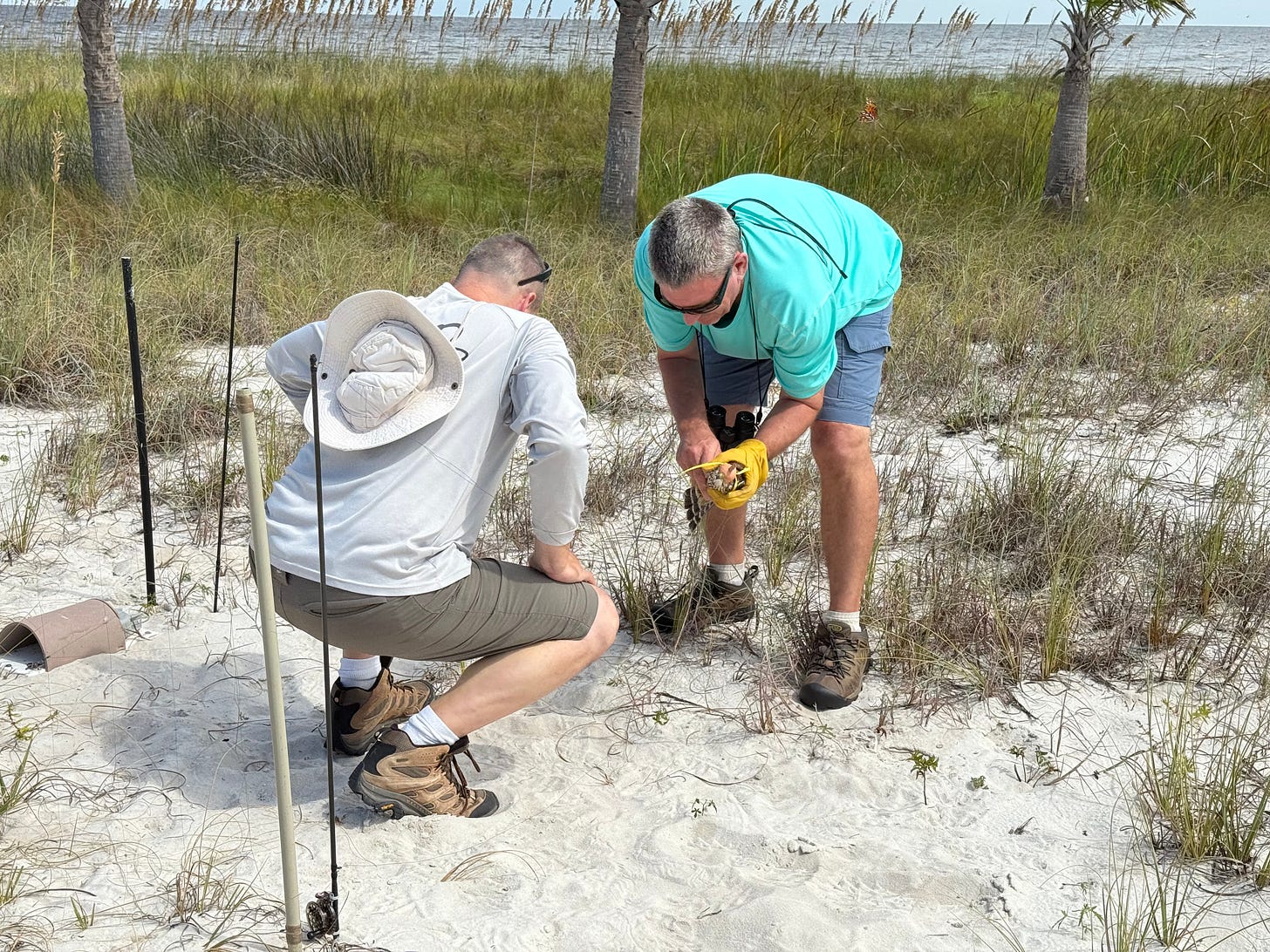 A house sparrow wearing a tethered harness bounces near its hovel in the sand, dancing in front of our gossamer nets.